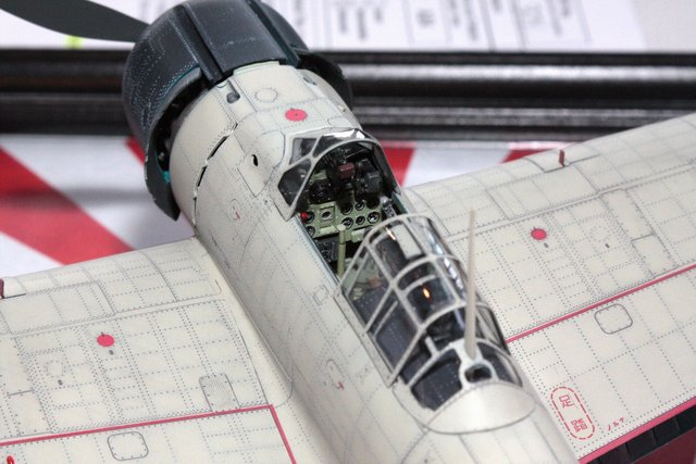 The cockpit pieces were sprayed with Tamiya’s IJN Interior colour green lightened 25% with flat white. I did this to have them stand out from the inside of the fuselage sides which were painted straight interior green. The difference is subtle but noticeable.
